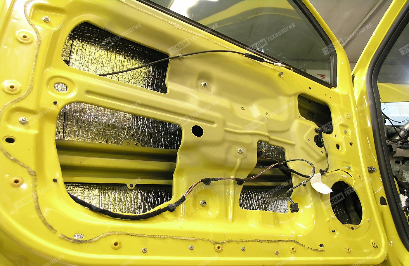 1-й слой: Виброизоляция внешней филенки – этим слоем ещё более повышаем её устойчивость к вибрациям, создаваемым аэродинамическим потоком и устраняем неприятный гул, который мы слышим во время движения.