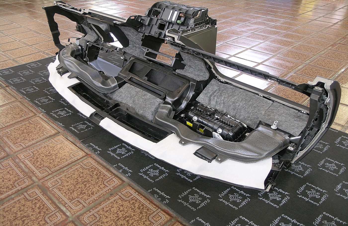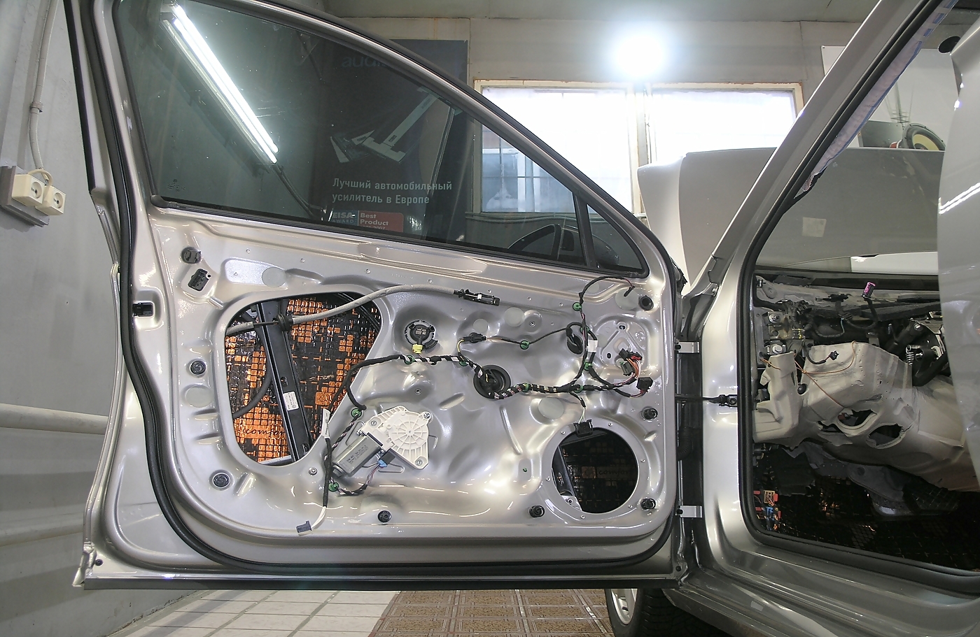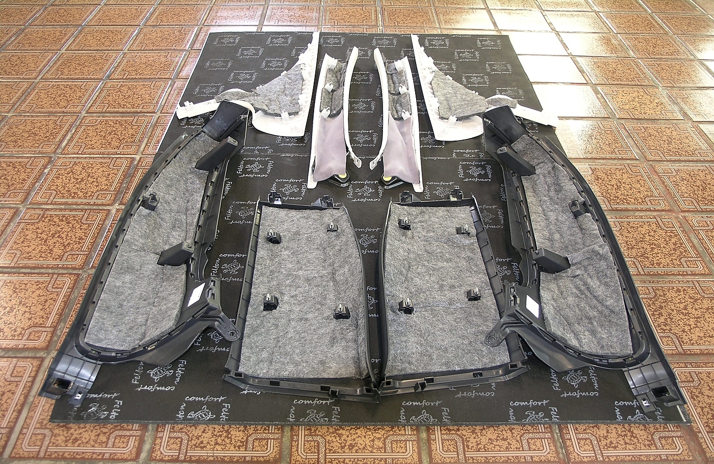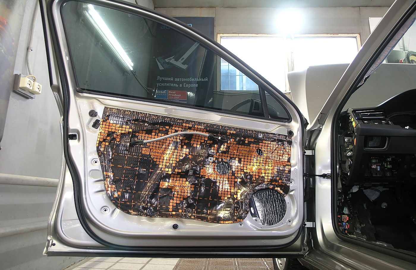 Ещё одно фото, это работа по обработке пластиковых деталей салона. Это тот объем работ, что зачастую остается за кадром. Проклейка стыковых элементов, применение вибропласта для пластика Comfort Mat Plastic P1 и наполнение акустическим войлоком TURBO Войлок 10.