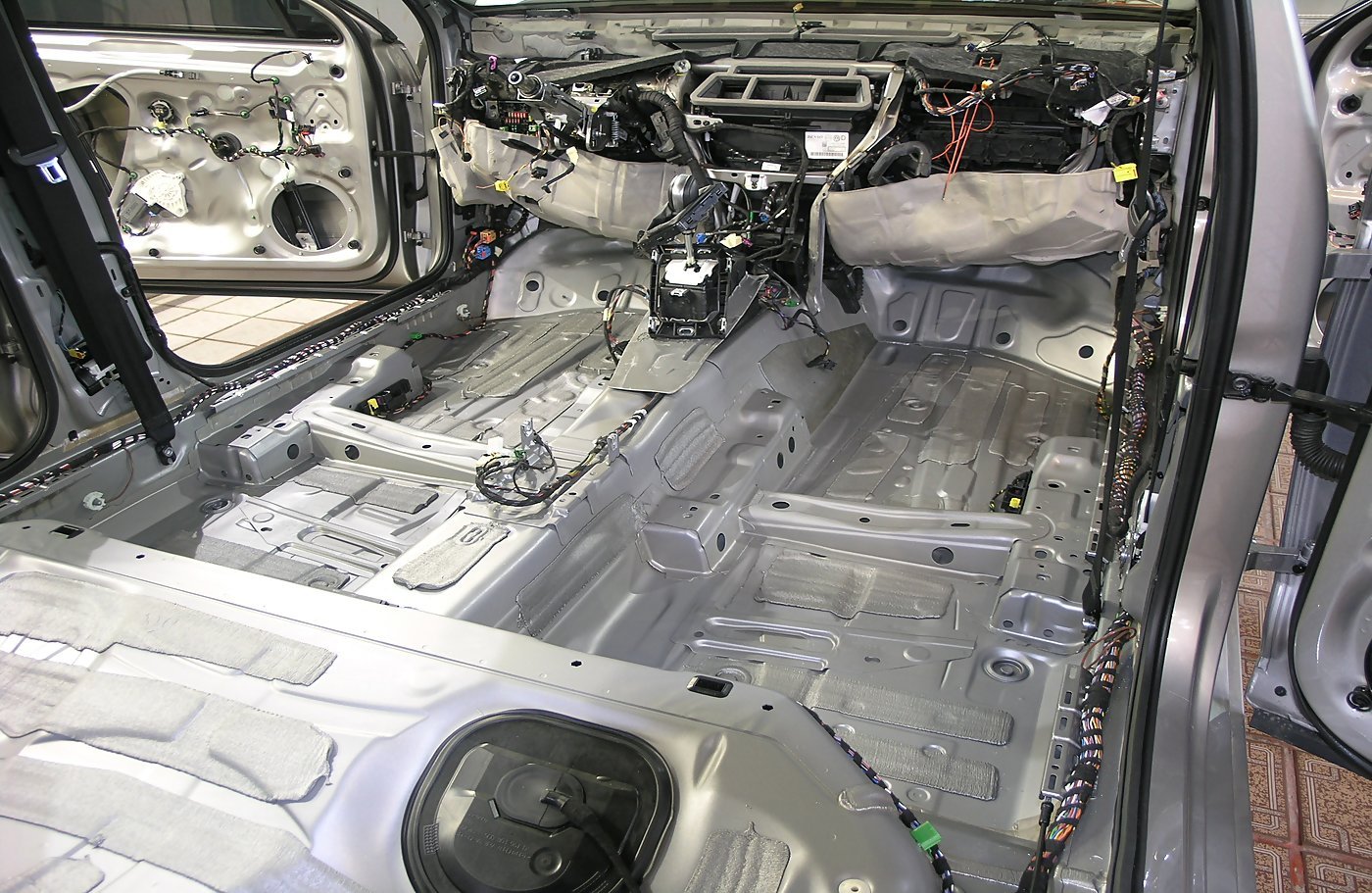 Параллельно с работами по вибро-шумоизоляции капота и передних колёсных арок, наша команда занимается полным разбором салона. Демонтируем поэтапно карты дверей, передние и задние сидения, центральную консоль, торпедо, детали салона, ковер пола салона и багажника, потолок.