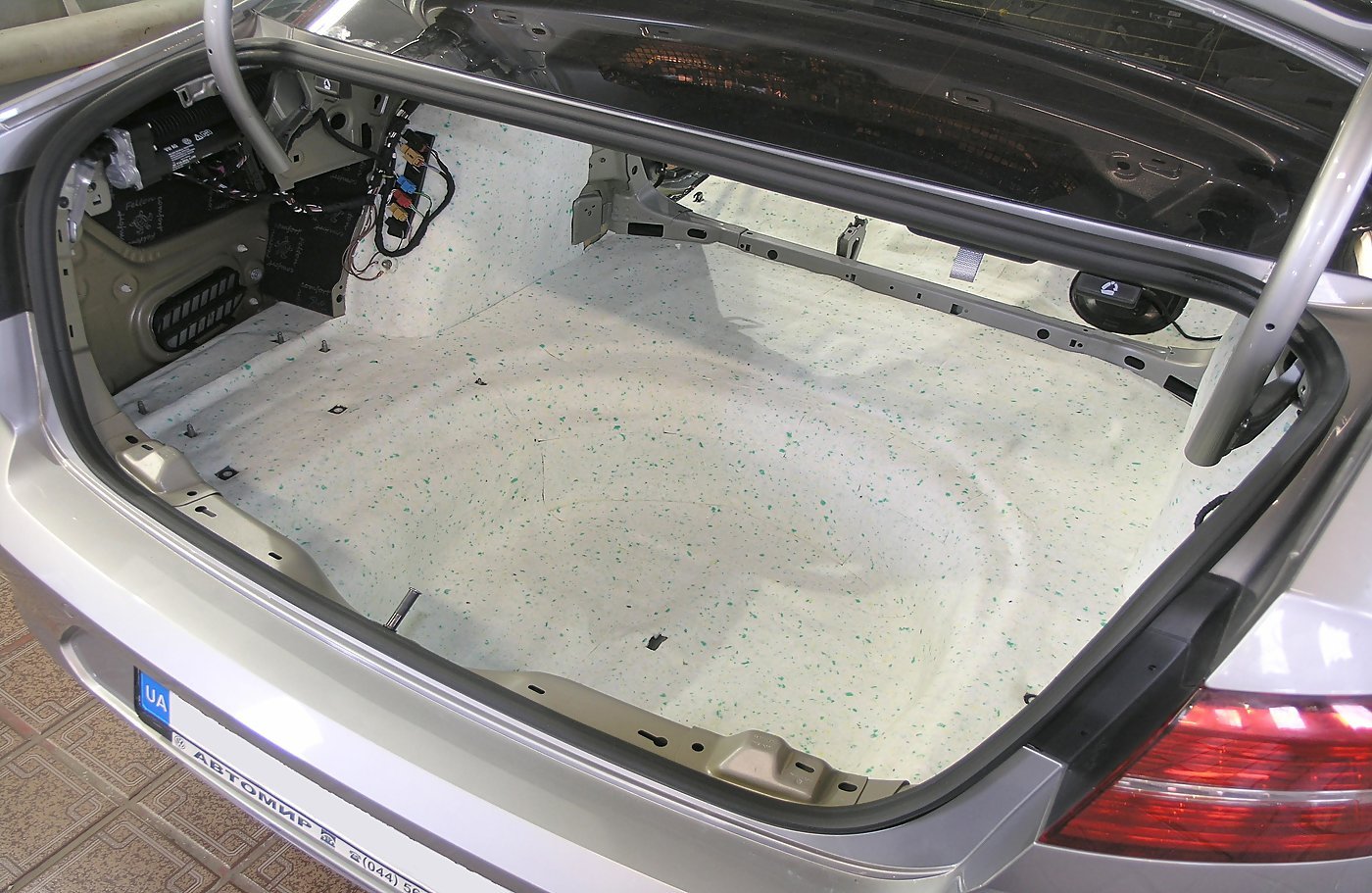 Багажник разобран, металл обезжирен и готов к оклейке. Пол багажника, задние колесные арки и крылья мы обрабатываем вибропластом Comfort Mat Dark D3.
