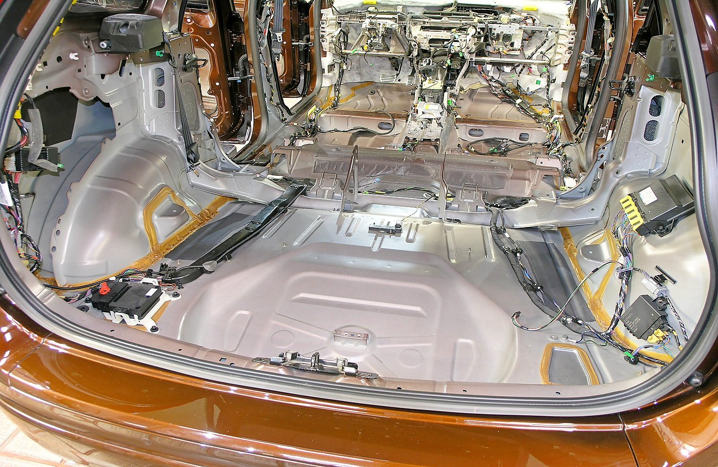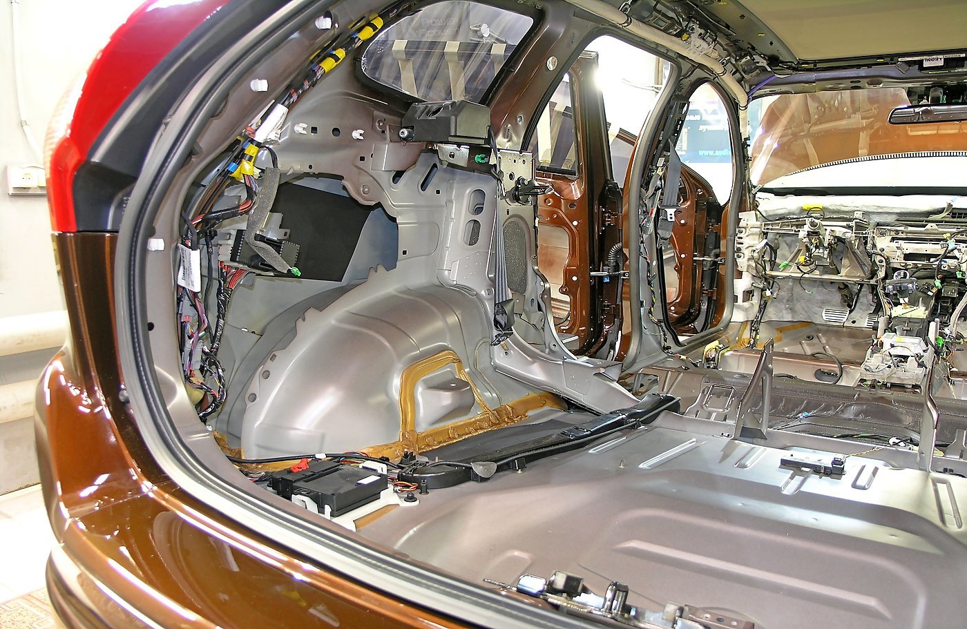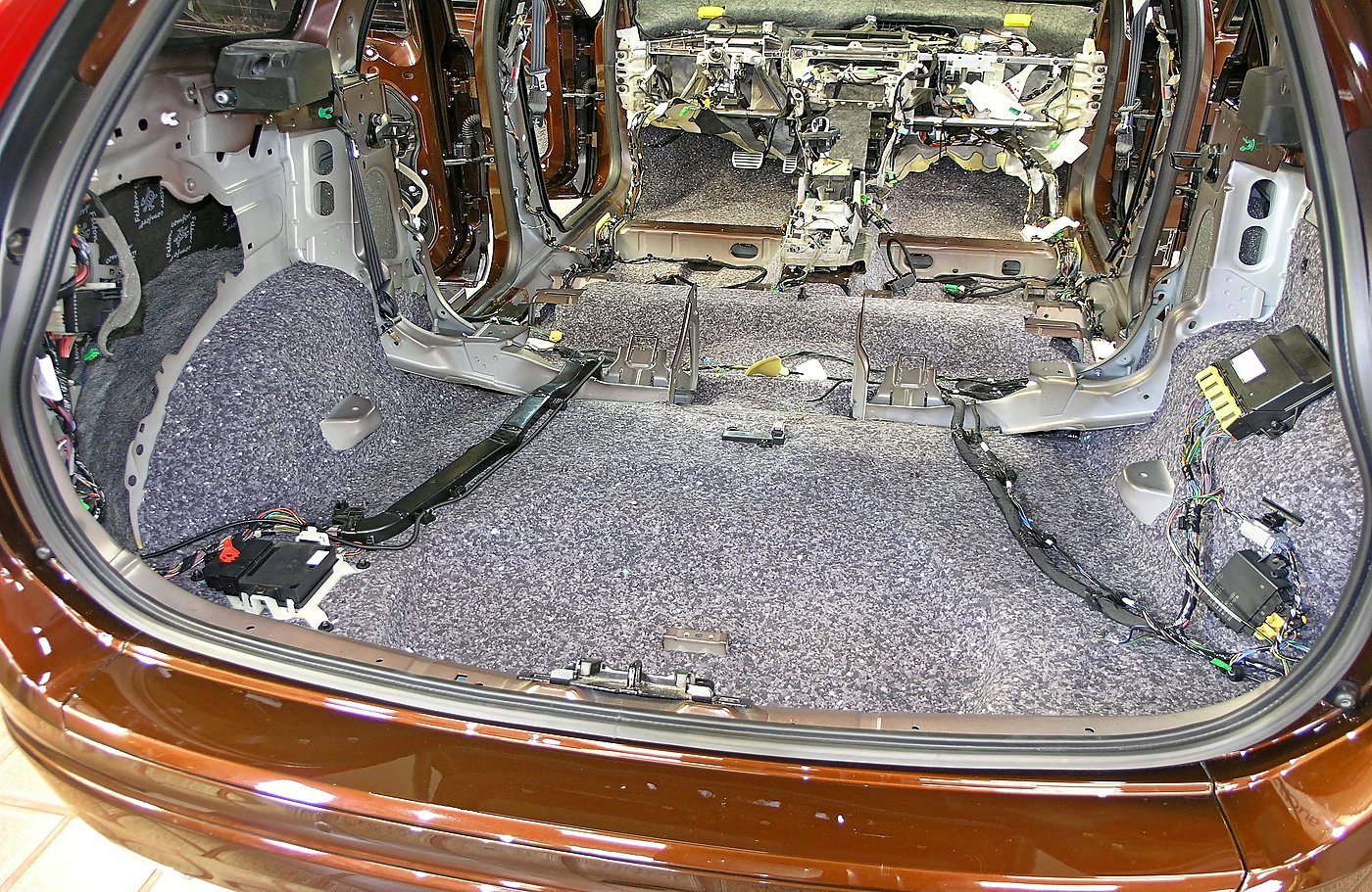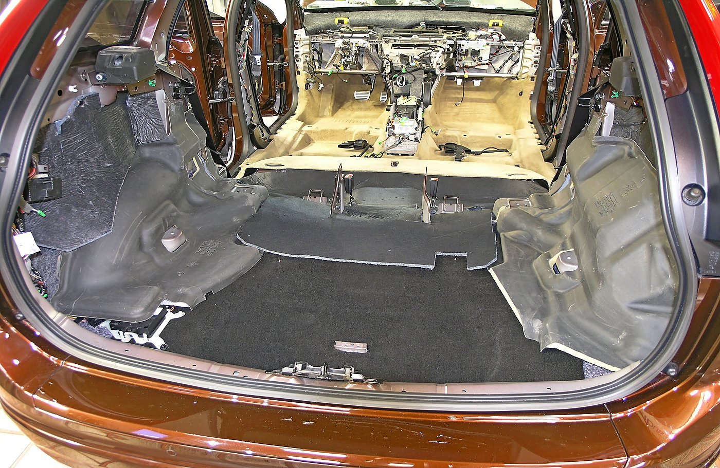 Шумоизоляция пола багажника и задних колесных арок VOLVO XC60. Багажник разобран, металл обезжирен и готов к оклейке.
