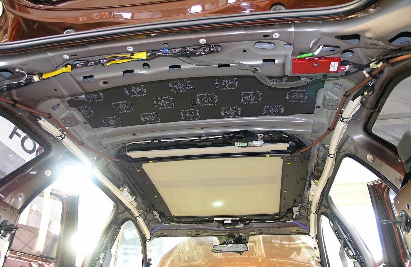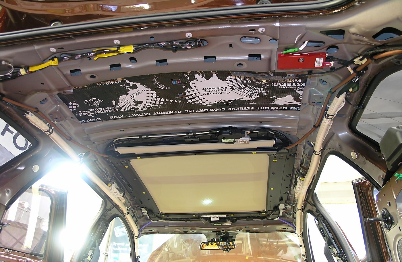 На данном автомобиле мы применим жёсткий и хорошо вяжущий вибродемпфер Comfort Mat ATOM, этот материал имеет толщину в 4,2мм и представляет собой одну из самых современных битумно-мастичных композиций производимых на сегодняшний день. Comfort Mat ATOM занимает свое место на потолке и существенно повышает жесткость металла и его устойчивость к вибрациям аэродинамического и гидродинамического происхождения, которые и порождают неприятный гул в автомобиле.