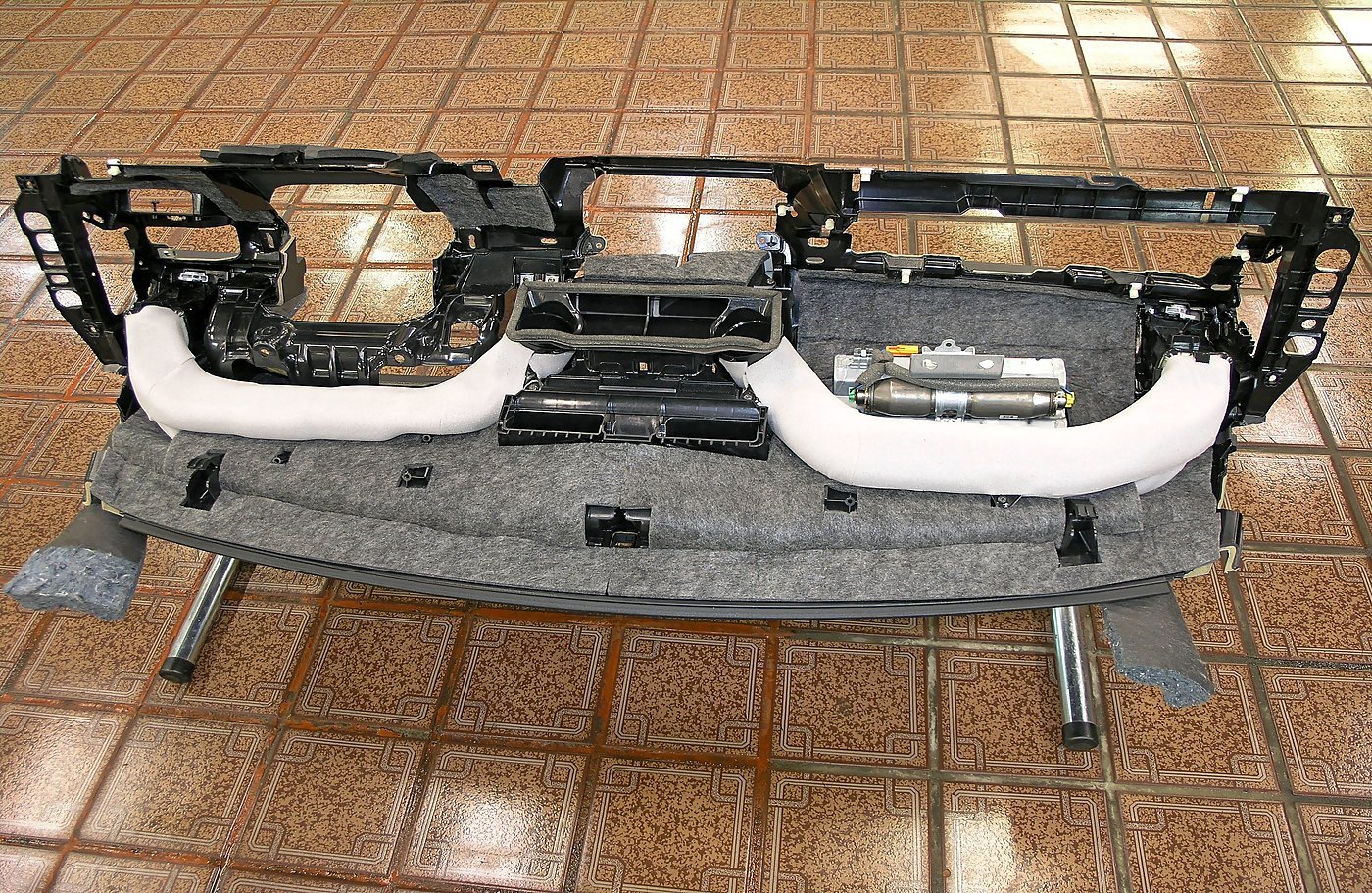 Для демпфирования пластика торпедо, используем первым слоем разработанный для пластика вибродепфирующий материал Comfort Mat Plastic P1. Прилягающие элементы и части торпедо обрабатываются и проклеиваются специальными материалами для стыковки и уплотнения деталей, воздуховоды проклеиваются прокладочным поролоном TURBO FLEX 5, а плоскости торпеды обрабатываются акустическим войлоком TURBO Войлок 10.