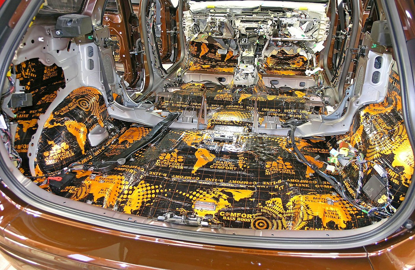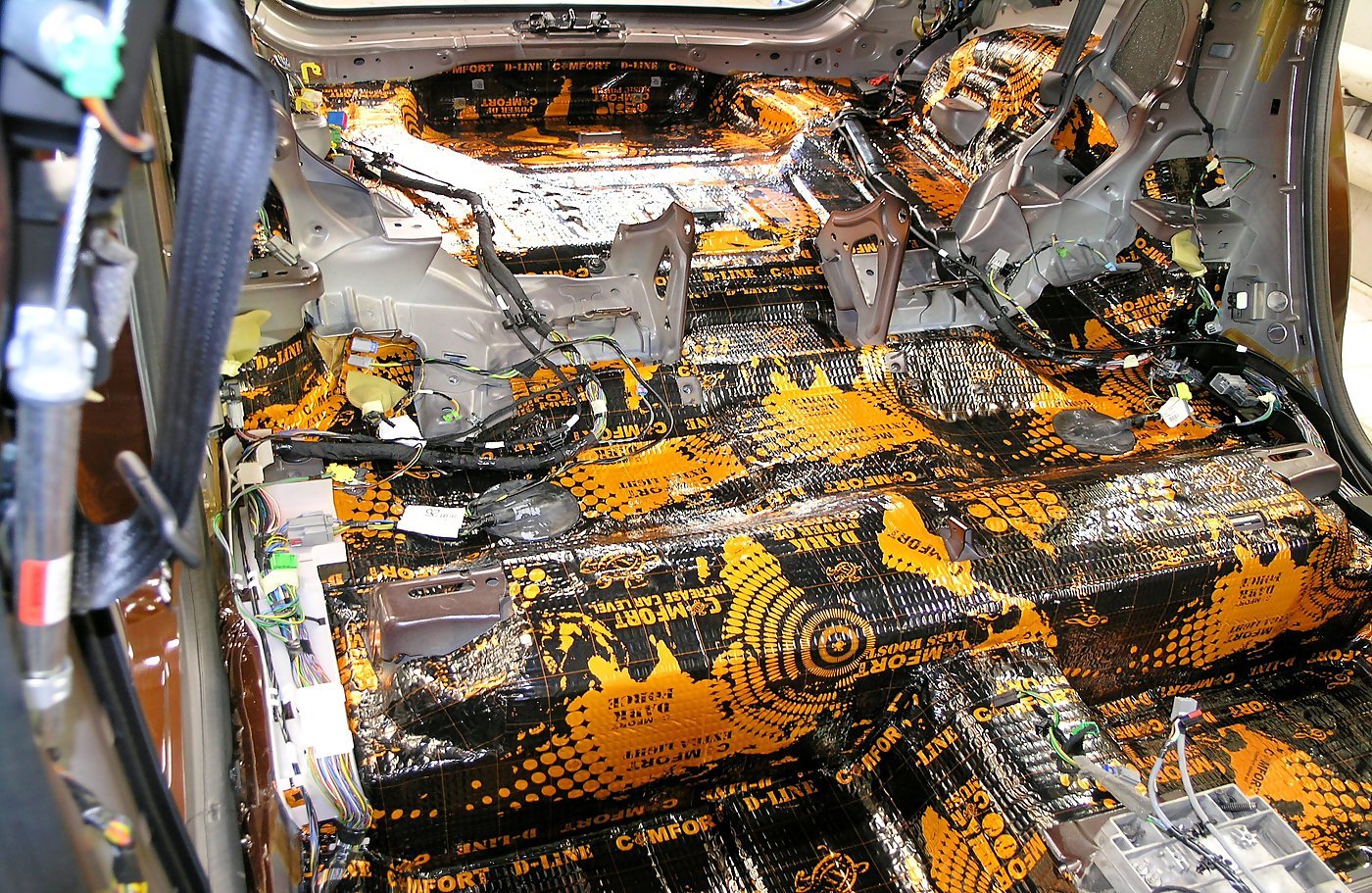 Пол багажника и крылья мы обрабатываем вибропластом Comfort Mat D-line D3, а задние колесные арки Comfort Mat D-line D4.