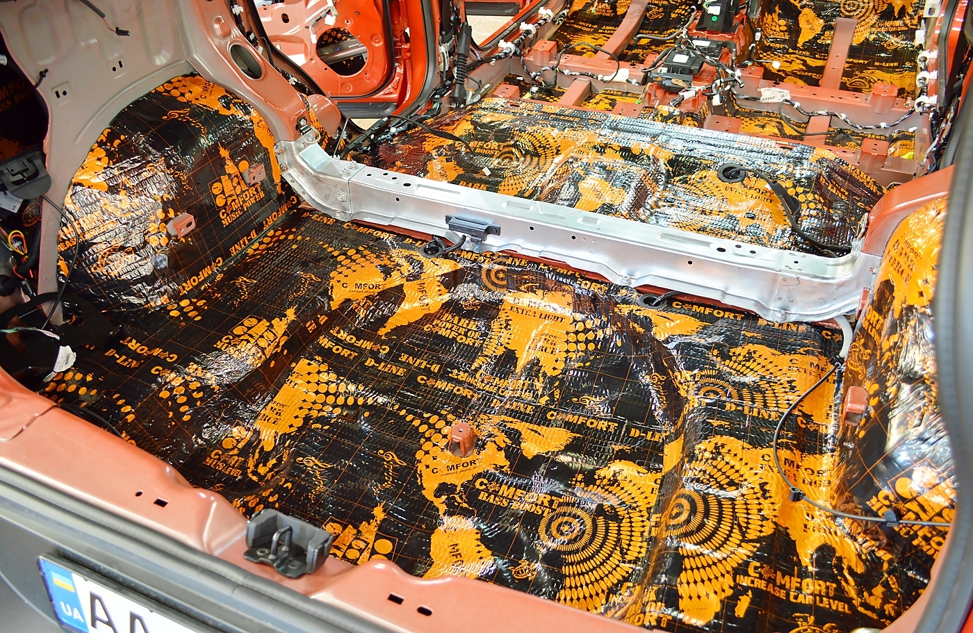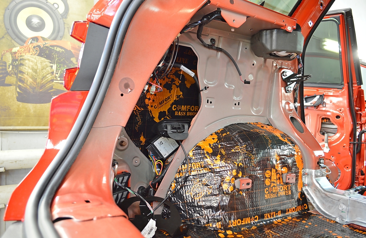 Пол багажника и крылья мы обрабатываем вибропластом Comfort Mat D-line D3, а задние колесные арки Comfort Mat D-line D4.