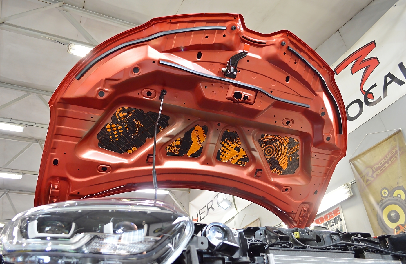 Шумоизоляция капота и подкапотного пространства Renault KADJAR, начинается с обезжиривания металла капота, после чего на металл наносится виброизоляция Comfort Mat D-line D2.