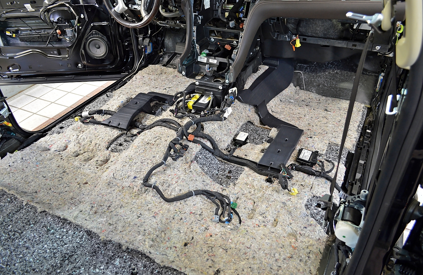 Шумоизоляция пола салона Cadillac Escalade. Мы разбираем и выносим из салона абсолютно все, что может помешать в нашей работе. Очищаем и устраняем все возможные загрязнения.