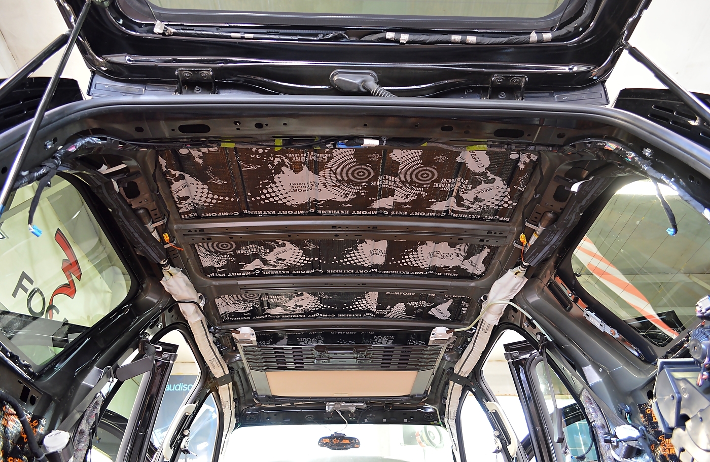На данном автомобиле мы применим жёсткий и хорошо вяжущий вибродемпфер Comfort Mat ATOM, этот материал имеет толщину в 4,2мм и представляет собой одну из самых современных битумно-мастичных композиций производимых на сегодняшний день. Comfort Mat ATOM занимает свое место на потолке и существенно повышает жесткость металла и его устойчивость к вибрациям аэродинамического и гидродинамического происхождения, которые и порождают неприятный гул в автомобиле.
