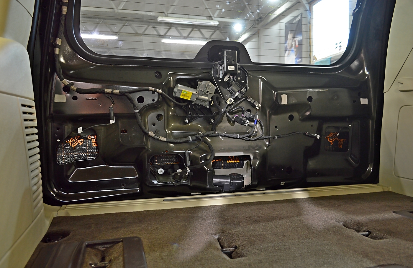 Дверь багажника Cadillac Escalade, демпфируется вибропластом Comfort Mat D-line D2, для того что бы придать нужный звуковой эффект при открытии и закрытии.