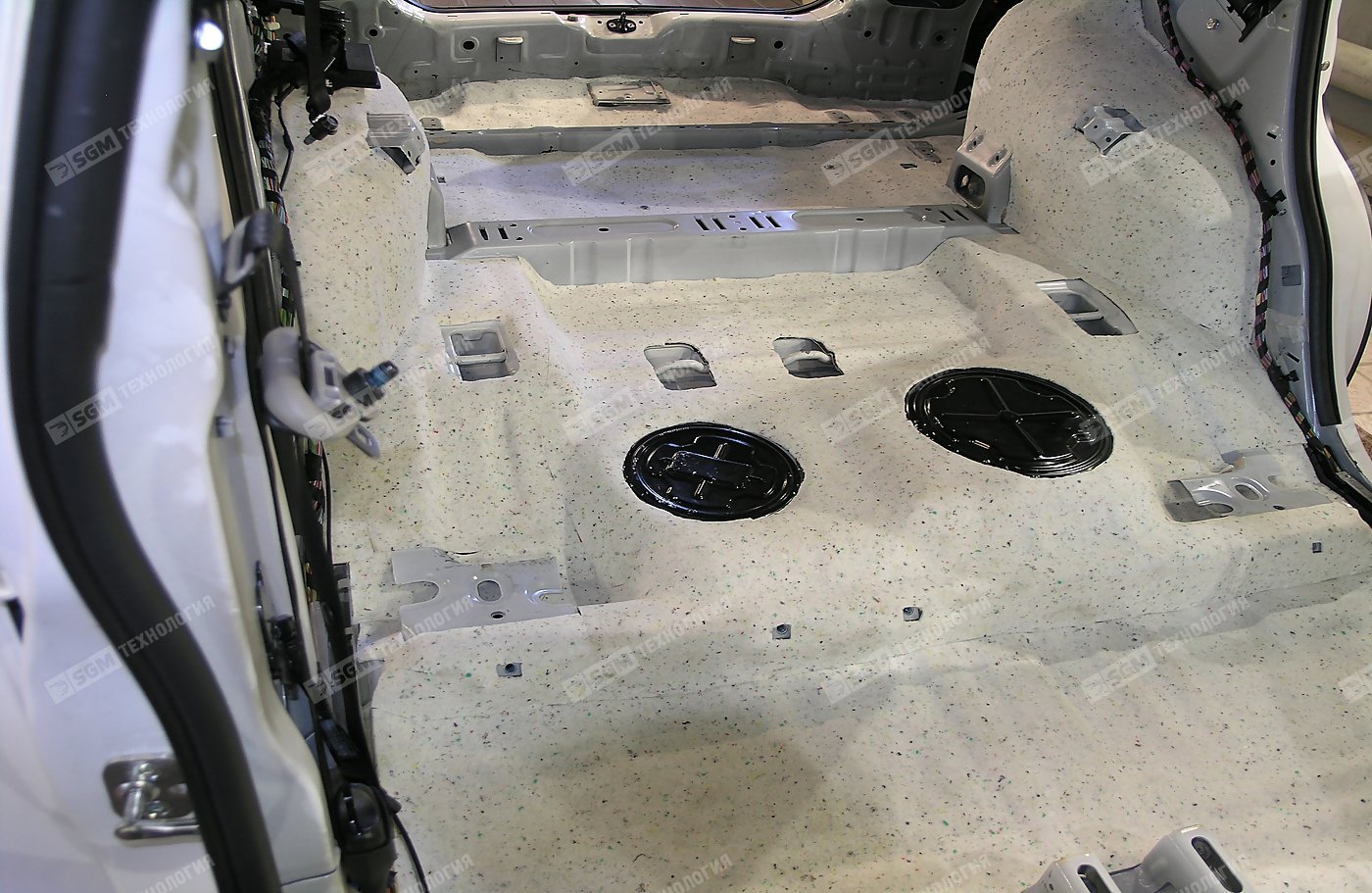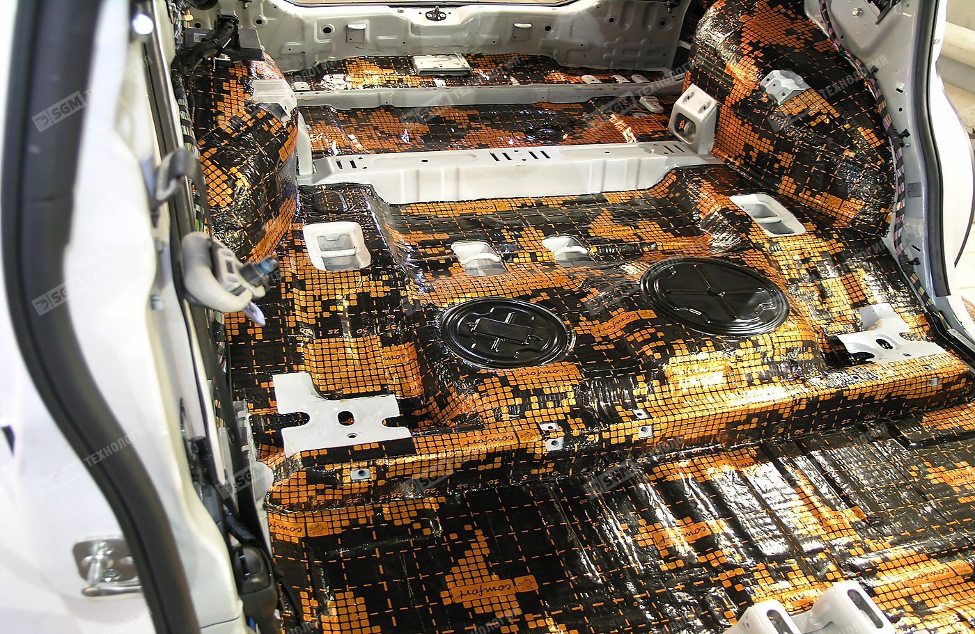Шумоизоляция пола багажника и задних колесных арок выполняется звукопоглотителем Comfort Mat Lock4, а крылья закрываем акустическим войлоком Comfort Mat FELTON.