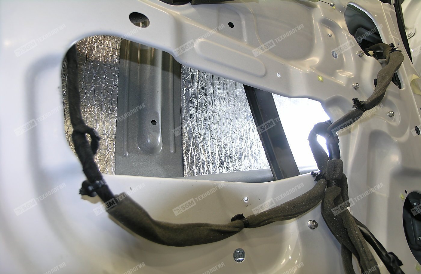 1-й слой: Виброизоляция внешней филенки – этим слоем ещё более повышаем её устойчивость к вибрациям, создаваемым аэродинамическим потоком и устраняем неприятный гул, который мы слышим во время движения.