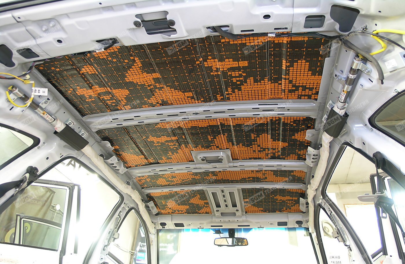 Металл крыши очищается и обезжиривается. Вибродемпфер Comfort Mat Dark Bomb толщиной 4,2мм занимает свое место на потолке и существенно повышает жесткость металла и его устойчивость к вибрациям аэродинамического и гидродинамического происхождения, которые и порождают неприятный гул в машине. Материал разогревается и плотно прикатывается к металлу, а его высокая адгезия будет способствовать его надежному расположению на потолке.