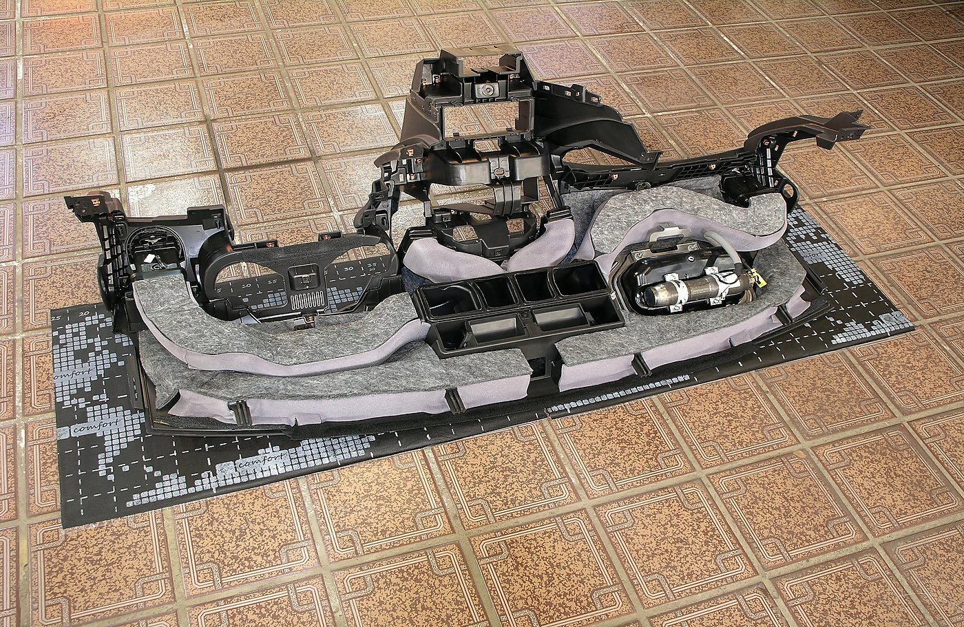 Для демпфирования пластика торпедо используем первым слоем специально разработанный вибродепфирующий материал Comfort Mat Plastic P1. Прилегающие элементы и части торпедо обрабатываются и проклеиваются специальными материалами для стыковки и уплотнения деталей, воздуховоды проклеиваются специальным прокладочным поролоном Comfort Mat Ultra Soft 5, а плоскости торпеды обрабатываются акустическим войлоком TURBO Войлок 10.