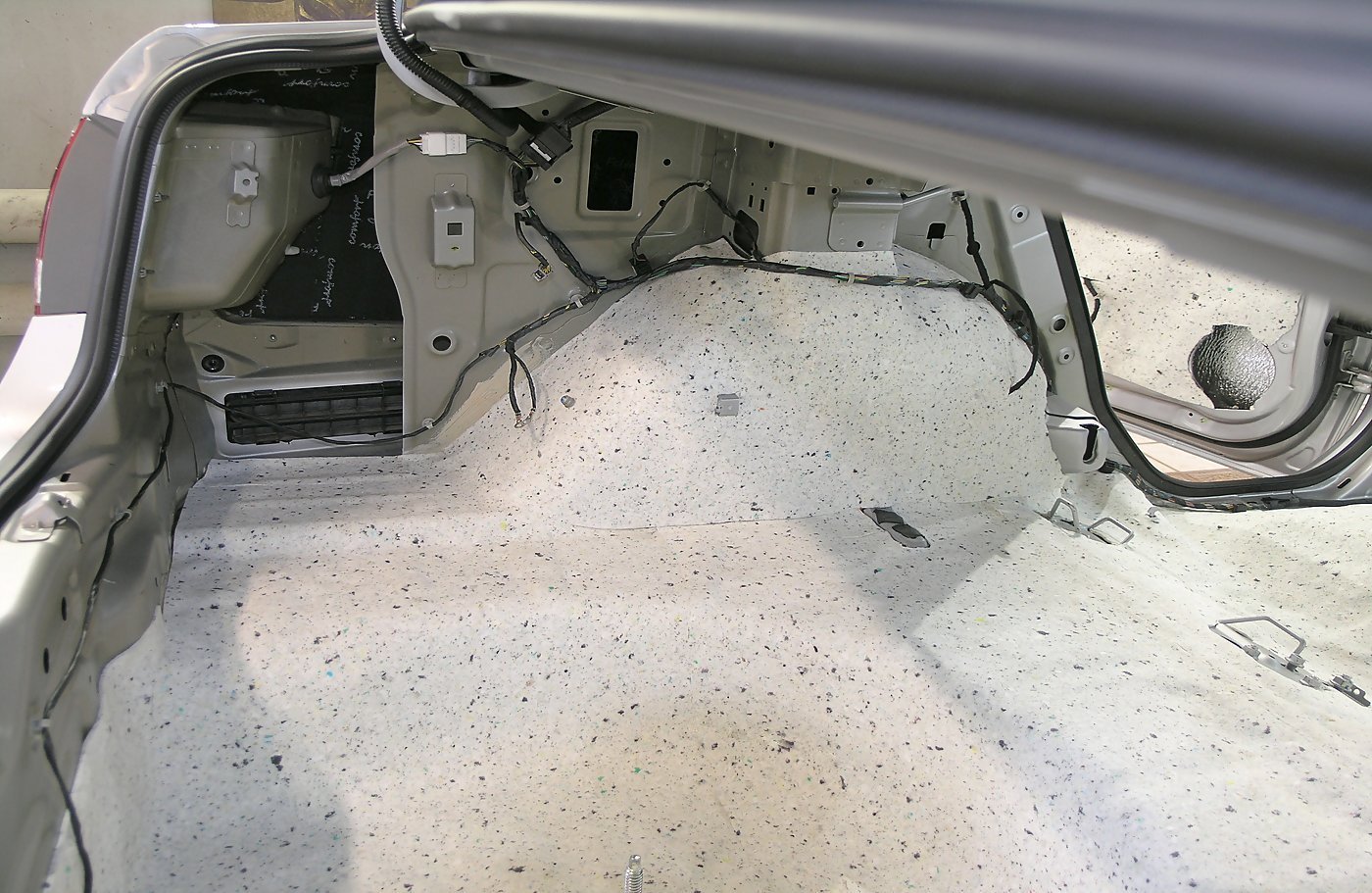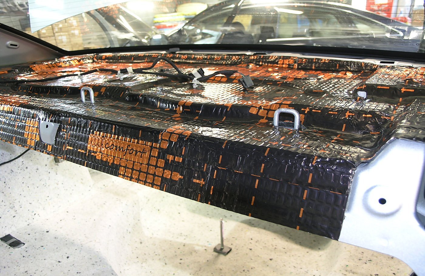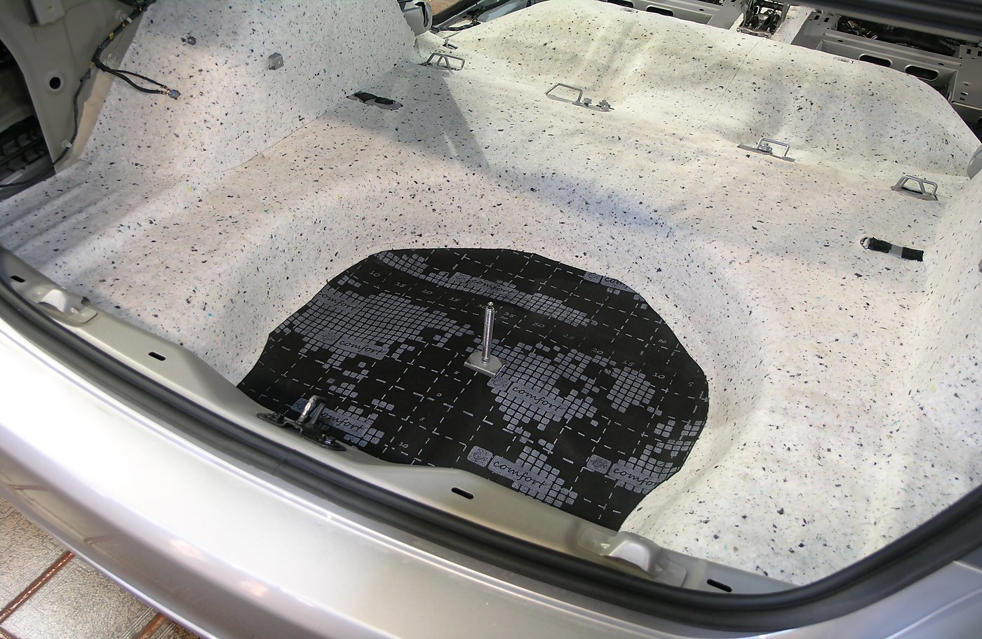 Шумоизоляция пола багажника и задних колесных арок выполняется звукопоглотителем Comfort Mat Lock4, а крылья закрываем акустическим войлоком Comfort Mat FELTON.