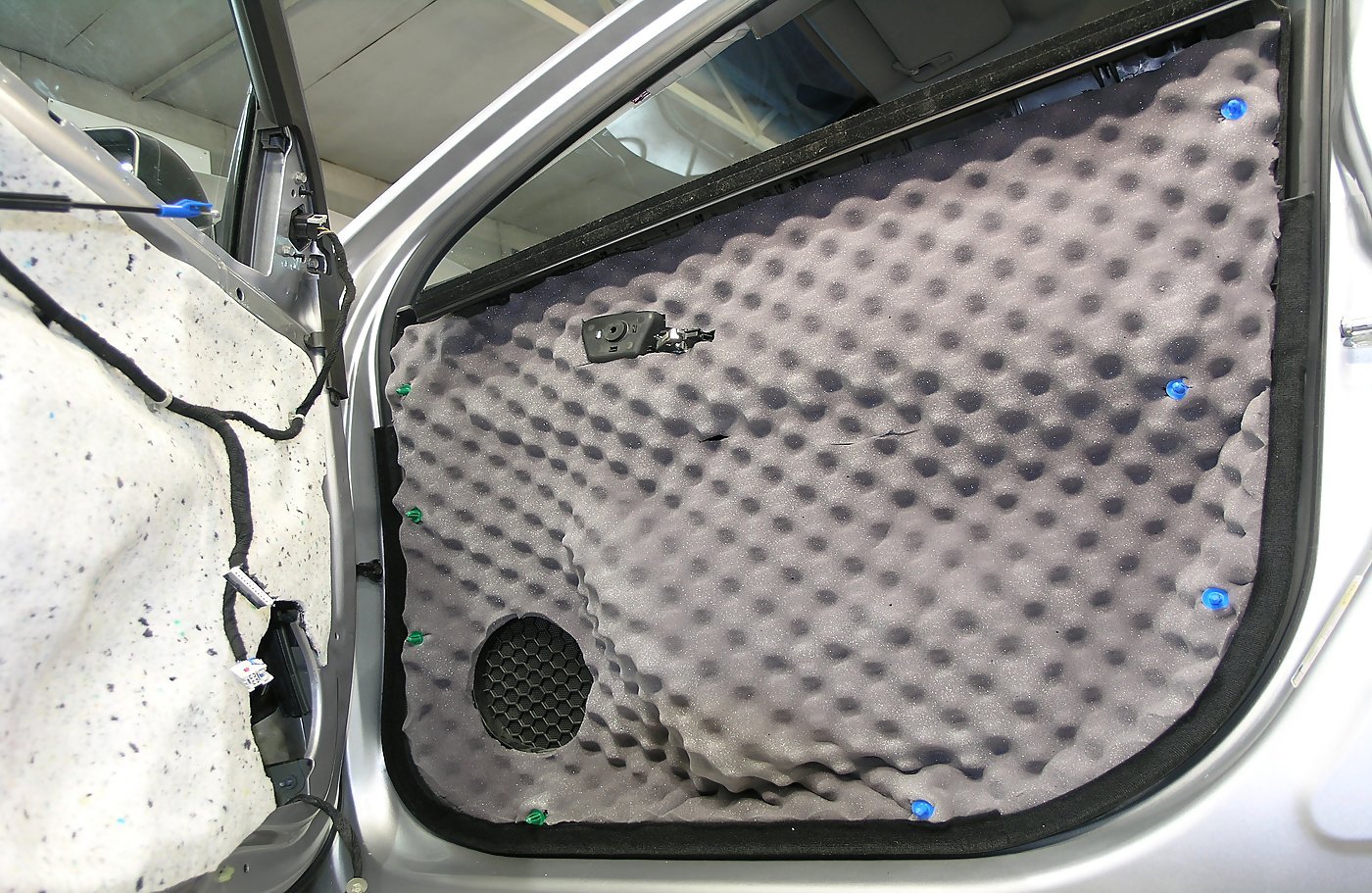 Виброизоляция внешней филенки – этим слоем ещё более повышаем её устойчивость к вибрациям, создаваемым аэродинамическим потоком и устраняем неприятный гул, который мы слышим во время движения.