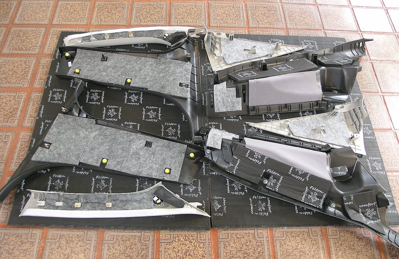Ещё одно фото, это работа по обработке пластиковых деталей салона. Это тот объем работ, что зачастую остается за кадром. Проклейка стыковых элементов, применение вибропласта для пластика Comfort Mat Plastic P1 и наполнение акустическим войлоком TURBO Войлок 10.